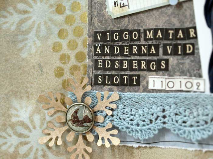 På 2011 års andra dag var vi och matade fåglarna vid Edsvikens vatten! Det vintergråa vädret och Viggos overall inspirerade mig att jobba med både kalla grå färger och guldigt bruna. I botten har jag använt ett papper från Glitz serie Vintage love. Pappret heter Vintage Love-Letters. Jag lade utstansade snöflingor runtom på pappret och sprayade med mist i guldig nyans. Jag använde även de som jag använt som mallar sedan på layouten. De var då gyllene och fina. Några snöflingor i blått med de fina stora bradsen från Lost and Found fick också dekorera min layout.